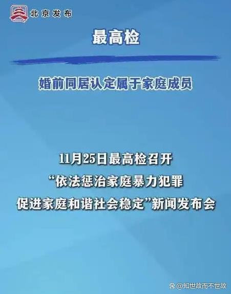 去年十一月,最高检提出新规定,过去只有领了结婚证才算一家人,现在不一样了,只要两个人长期住在一起,钱一起用,生活上互相依靠,就算没结婚也能算作家庭成员,精神上的虐待也算家庭暴力,可以报警也可以去法院起诉,这个变化是为了解决实际问题,以前很多同居关系中的暴力事件,警察常常不立案,理由是双方没结婚不算家务事。