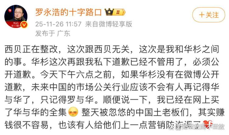 到了中午,战火进一步升级。罗永浩明确表示,此事已与西贝无关,纯粹是他与华杉之间的个人恩怨。他要求华杉必须公开道歉,并设下了当天下午6点的期限。