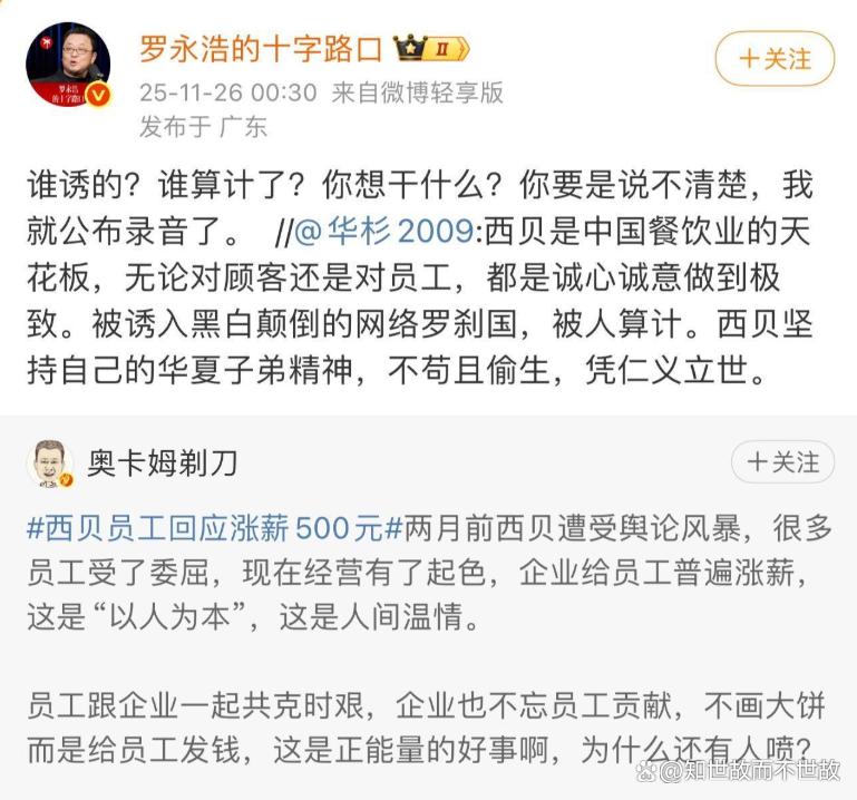 华与华创始人华杉此前在评论西贝员工涨薪事件时称,西贝是“被诱入黑白颠倒的网络罗刹国,被人算计”。正是这句“被人算计”的表述,引发了罗永浩的强烈反应。
