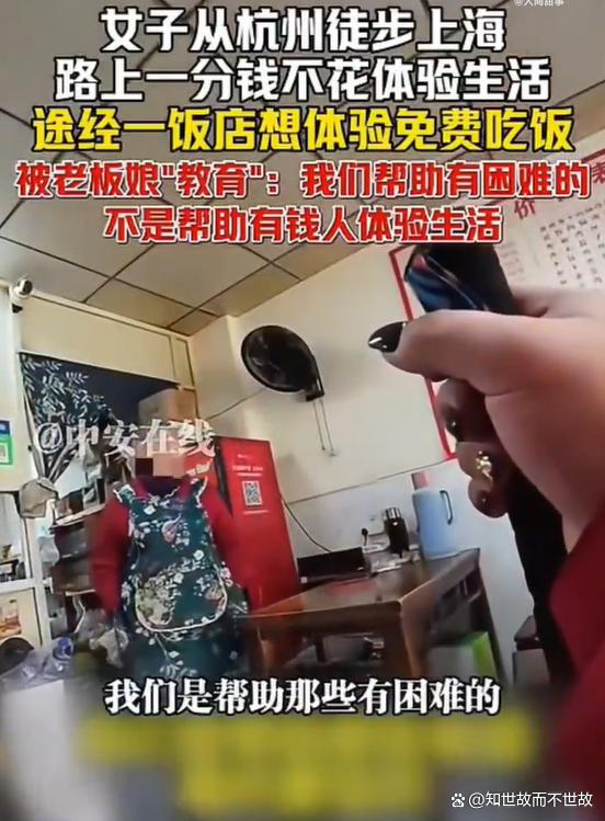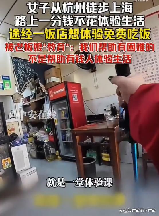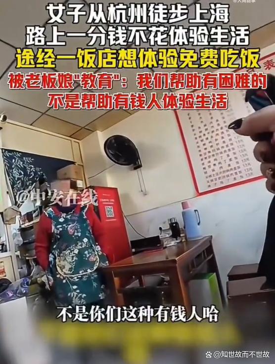 随后她走进一家饭店试图获取免费餐食,却遭到老板娘的“教育”:“你们这些有钱人,还来体验生活,一顿饭钱都舍不得给。”