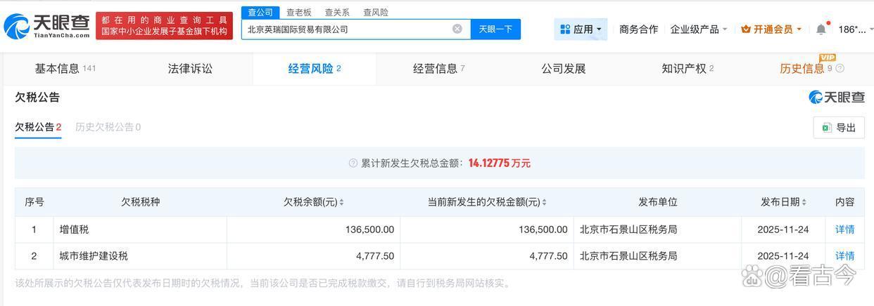 可谁能想到,这么一家看似稳稳当当的公司,却在2025年11月24日,被国家税务总局北京市石景山区税务局给盯上了。为啥呢?原来,这家公司新增了两则欠税公告,欠税余额合计约14.13万元。这钱都欠在哪儿了呢?其中增值税就有13.65万元,城市维护建设税也有4777.5元。这数字一出来,不少网友都惊了:“就这十几万,对明星来说还不是小意思嘛,咋还能欠税呢?”