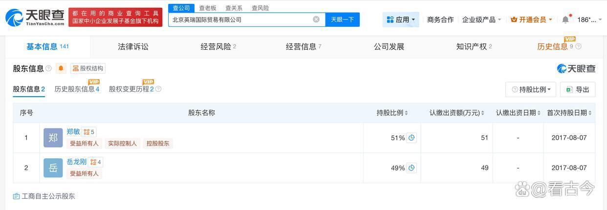 先说说这公司的基本情况。北京英瑞国际贸易有限公司,听名字挺高大上的,其实它成立于2014年8月,注册资本有100万人民币呢。这公司的法定代表人是谁呢?就是岳云鹏的老婆郑敏,而岳云鹏自己持股49%,郑敏持股51%,夫妻俩这是齐心协力搞事业啊。