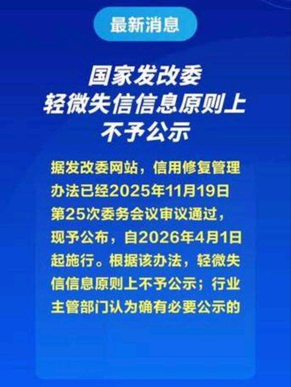 各位“信用小白”和“老赖克星”们注意啦!2025年11月26日,国家发改委甩出一份重磅文件——《信用修复管理办法》,直接给失信信息来了个“分级管理+差异化公示”的豪华套餐。这波操作就像给信用体系装了个“智能调节器”,让失信者不再“一失足成千古恨”,而是有了“改过自新”的明确路径。
