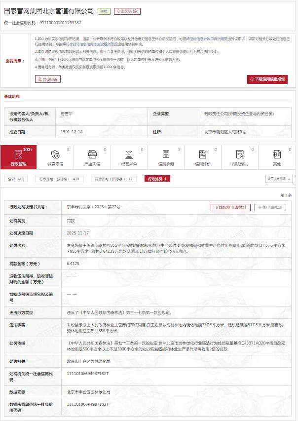 近日,信用中国公示了国家管网集团北京管道有限公司的行政处罚决定。处罚决定书文号为京丰绿罚决字﹝2025﹞第27号,指出该公司未经县级以上人民政府林业主管部门审核同意,在王佐镇沙锅村林地内硬化地面337.5平方米、建设建筑物517.5平方米,擅自改变林地用途面积共855平方米。
