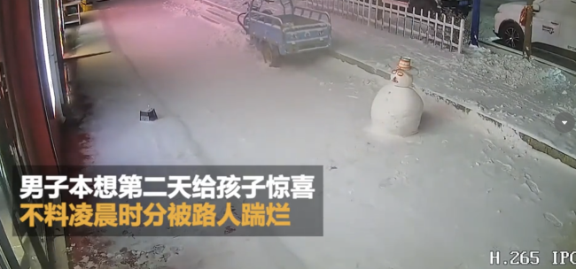 父母为给娃惊喜堆雪人却被路人踢碎