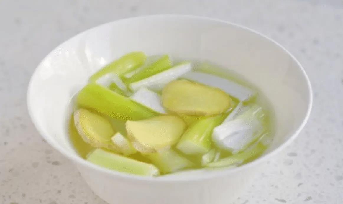 图片来源于网络 侵删1、碗中倒入温水,放入姜片、葱片,浸泡到水凉下来,再下手抓一抓,让葱姜水变得更浓郁,处理好后放在一边待用。