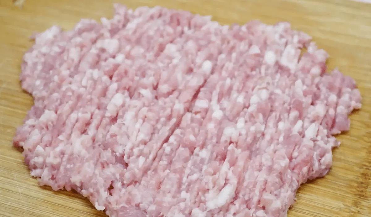 2、猪肉去皮,冲洗干净,把筋膜去除掉,再剁成肉糜,手剁要辛苦些,剁得越细腻越好。怕麻烦,可以用绞肉机,把肉块打成小颗粒状。