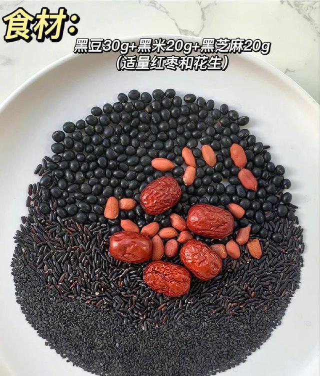 食材:黑豆30g、黑米20g、黑芝麻20g、红枣适量、花生适量