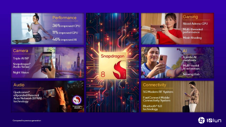 Snapdragon 8 Gen 5搭载量身打造的高通Oryon CPU,最高时脉可达3.8 GHz。除了运行速度更快外,相较前一代整体性能提升36%,网页浏览回应速度更快76%。即便在高负载应用程序下,也能保持出色的运行效率。此外,该平台搭载Hexagon NPU,性能较前代提升高达46%;Adreno GPU采用高通创新的切片式架构,支持更高时脉,让游戏与图形处理性能提升11%,带来更流畅的视觉体验。