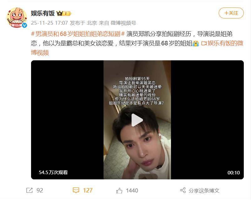 事情起因是郑凯在分享短剧拍摄经历时提到,导演一开始告诉他这是部“姐弟恋”题材。38岁的他理所当然地脑补了一场“霸总与年轻美女”的浪漫戏码,结果到了片场一看,对手演员竟是一位68岁的资深姐姐。这巨大的心理落差,让这场拍摄成了一场充满戏剧性的社交平台热点事件。