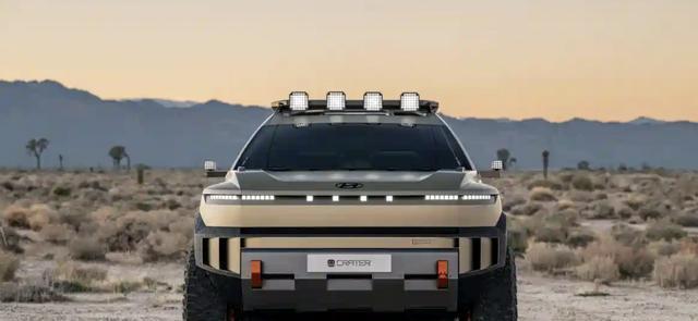 图片来源于网络 侵删整体来讲,现代Crater概念车外观采用的是非常前卫的赛博朋克的设计风格,包括前脸非常概念的大灯组,以及复杂的前脸线条感,橙色装饰点缀,车顶上的越野照明灯,还有专属的33英寸越野轮胎,像是大脚款一样,未来感十足。