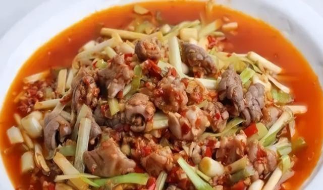 3、取锅大火烧热放熟菜籽油 ,烧至6成油温时,迅速的下入码好芡的猪肚头炒散(约 3 秒钟),加入碗中的大葱、韭黄和调料汁,再迅速炒 6 秒钟,将锅离火,用铲子铲几下,出锅装盘即成。