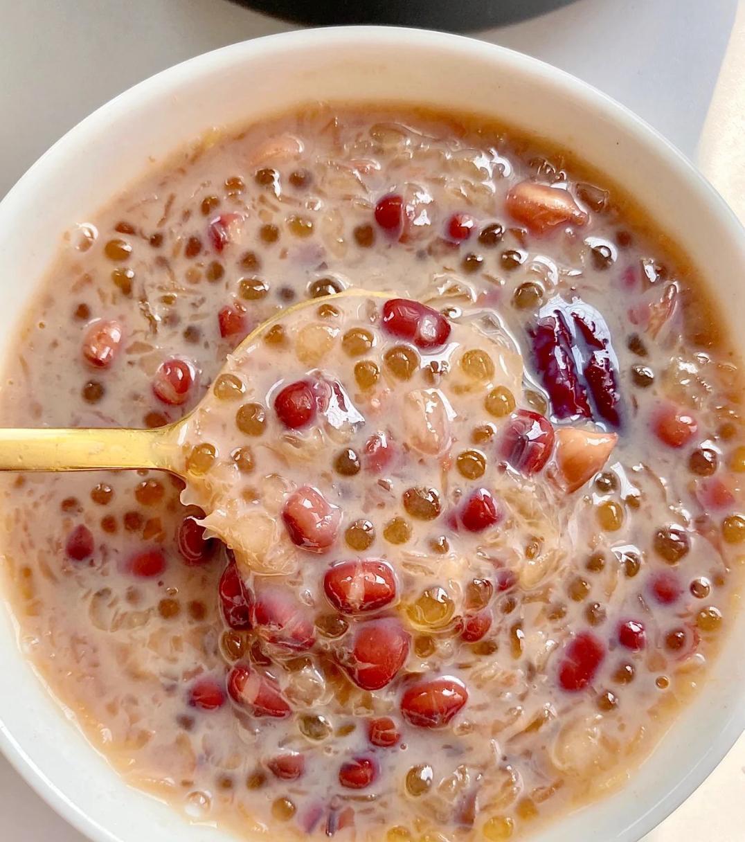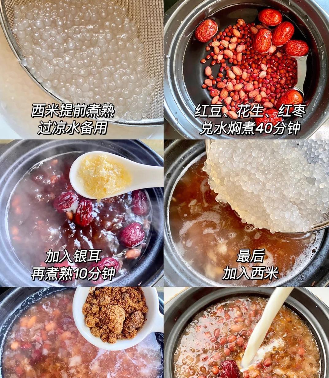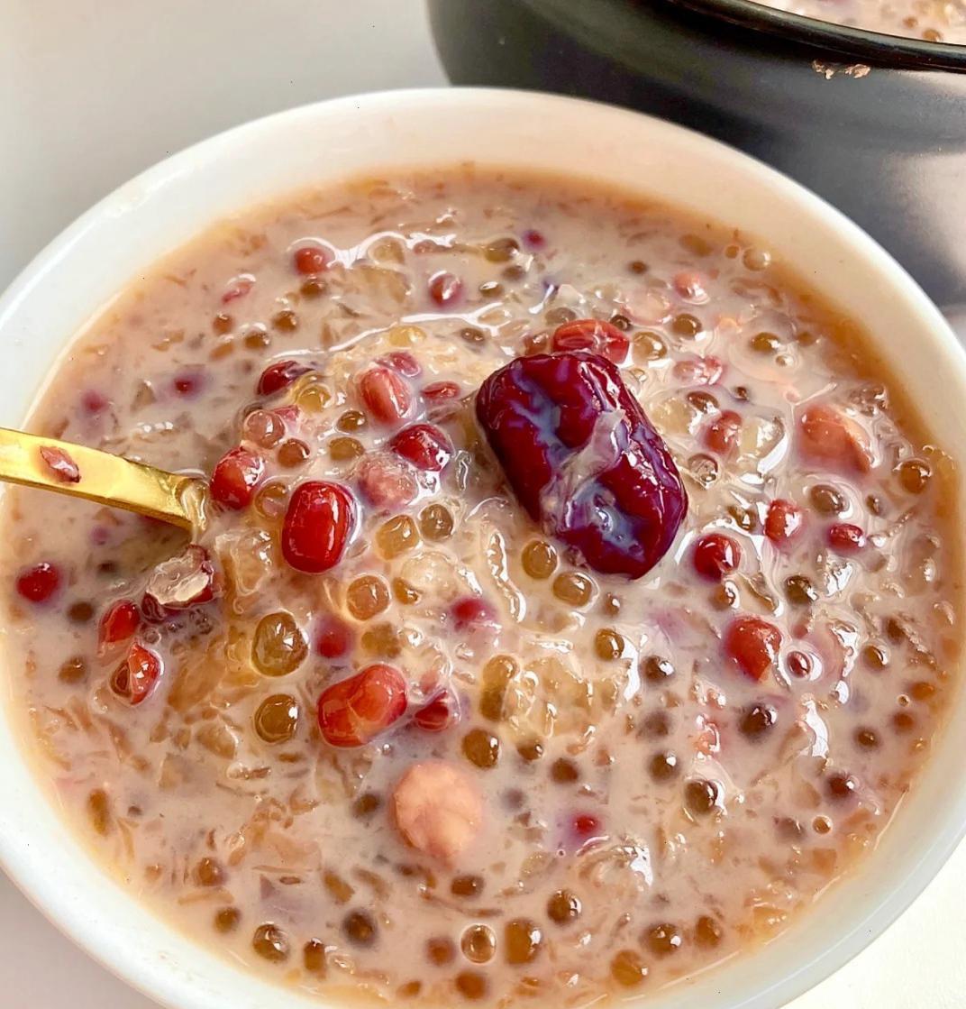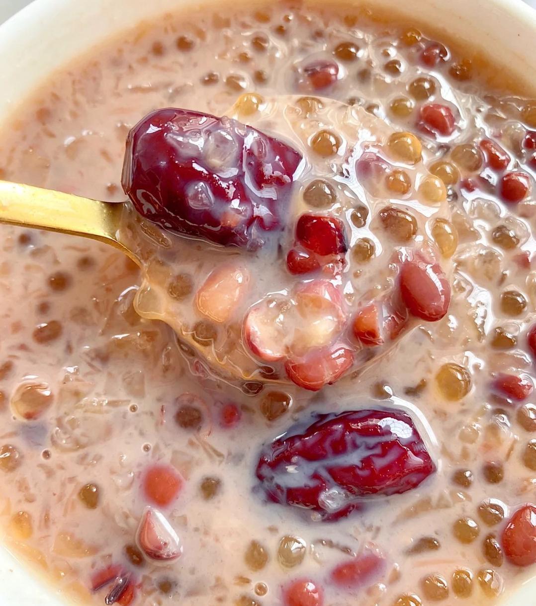 图片来源于网络 侵删做法也很简单哦!只需要提前把西米煮熟,过凉水备用。然后把红豆、红枣、花生加水焖煮40分钟,再加入银耳煮10分钟。最后倒入西米、红糖和牛奶,搅拌均匀就OK啦!你看,是不是很简单?