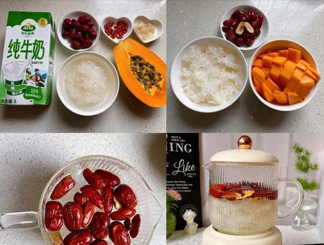 食材:半个木瓜、一小朵银耳、几颗红枣、适量冰糖、一袋牛奶、一小把枸杞