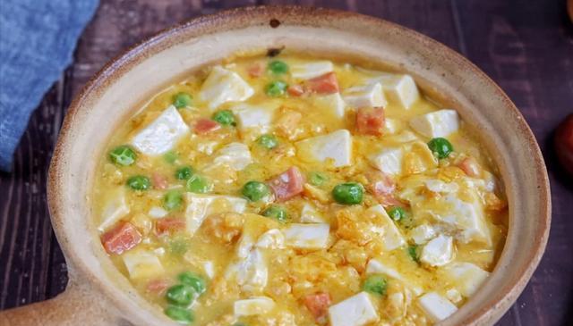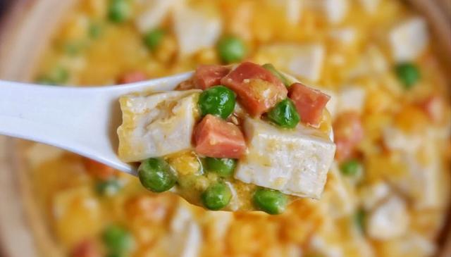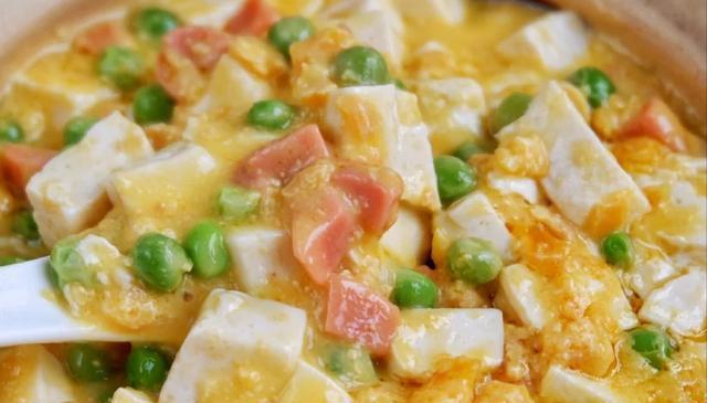 图片来源于网络 侵删你看,这道蟹黄豆腐,颜色金黄,豆腐丁鲜嫩滑口,豌豆粒翠绿翠绿的,火腿丁咸香可口,光是看着就让人食欲大增。