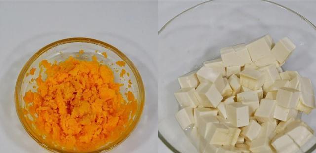1、把鸭蛋黄拿出来,用勺子或者擀面杖啥的给它压碎,压得越碎越好,这样等会儿炒的时候更容易出香味。接着把嫩豆腐拿出来,切成 1厘米 左右的小丁,切的时候小心点,别把豆腐弄碎了。