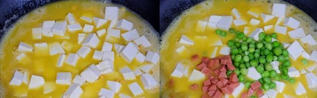 图片来源于网络 侵删食材:鸭蛋黄 3 个、嫩豆腐一块、熟豌豆粒适量、火腿肠一根、水淀粉、盐