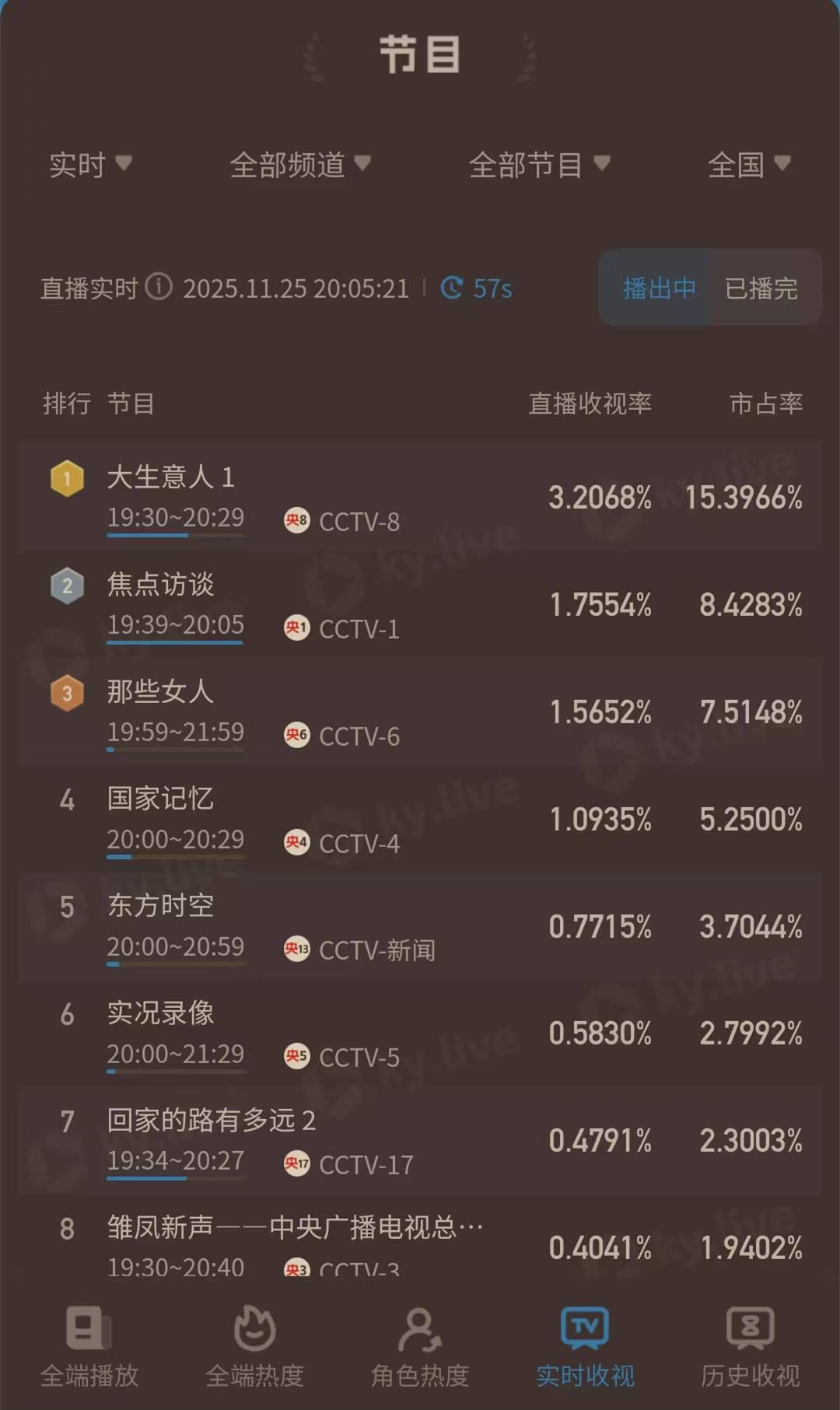 图片来源于网络 侵删先讲几句题外话。因为有几部流量古装剧在央八的收视率不好,所以,坊间有个遮羞的说法,说古装剧在央八收视率很低。这一次,《大生意人》在央八播出,在酷云上,首集的收视率就冲破了3.2%,这样的成绩可以说明,央八没有所谓的古装剧魔咒。质量高的电视剧,好看的电视剧,不分古装还是非古装,都会收视率高。
