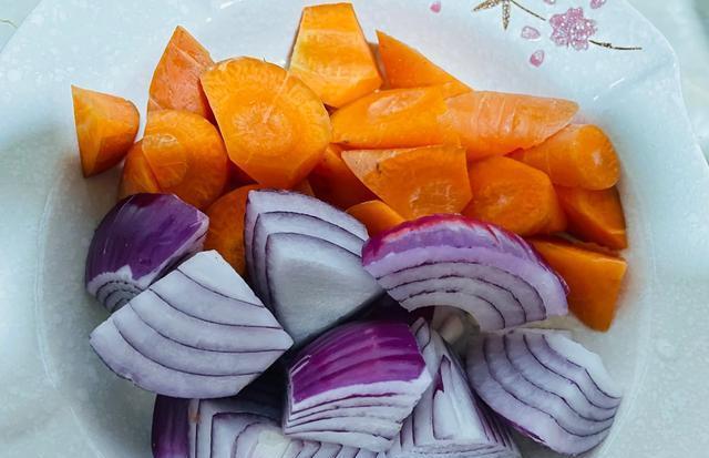 主料:牛肉、切块加少许食盐泡水一小时后备用、西红柿去皮切块备用、胡萝卜一根切块、洋葱小的切碎、葱、姜、蒜切碎、干辣椒?两个切碎. 香菜切段. 上海青少许洗净备用;