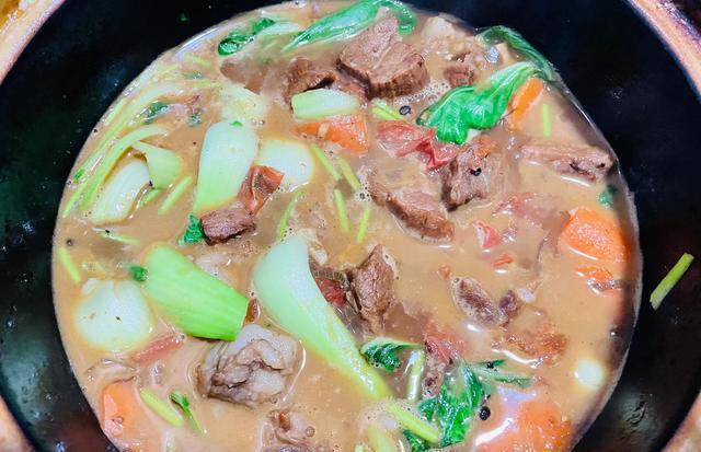 图片来源于网络 侵删3、加入浸泡好的牛肉翻炒,变色后加入老抽酱油和生抽和少许糖,炒上色后,倒入砂锅中.,加入一听啤酒。