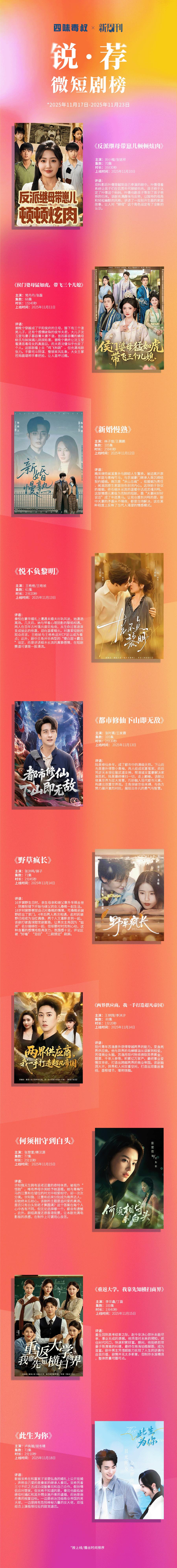 评语:秦悦在豪华婚礼上遭遇未婚夫出轨风波,她潇洒离场。几天后,她与带着心理阴影的黎焰相遇。两人在百年古村落共度花烛夜,从生命过客逐渐变成彼此的依靠,迎向温暖烟火。对喜爱短剧的观众而言,王皓祯与王格格这对CP足以成为看点;此外,剧中主角并非典型的“傻白甜+霸总”设定,而是讲述细水长流的真挚感情,在短剧赛道可谓是一股清流。