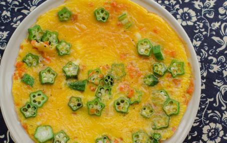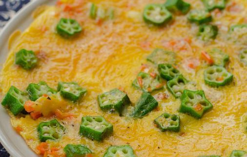 7. 装盘享用:两面煎至金黄且熟透后,将秋葵鸡蛋饼取出,切块装盘,可以搭配番茄酱或者辣酱一起食用,增添风味。