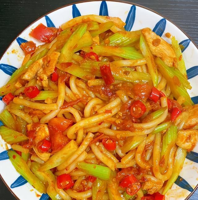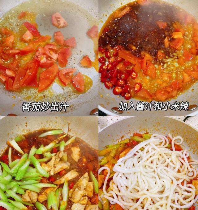 炒米粉要准备:西芹,鸡胸肉,一小半西红柿,盐,葱姜蒜锅里放一点点油,爆香葱姜蒜。(葱多放一点)放腌制切好的鸡胸肉(放点生粉一点点老抽腌制)到锅里翻炒一下,放西芹翻炒一分钟,最后再放西红柿翻炒。