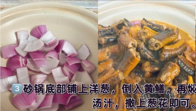 图片来源于网络 侵删步骤7:准备好一个砂锅,锅底铺上一层洋葱,倒入黄鳝继续焖煮,可以加上一些青红辣椒配色,最后撒上一些葱花点缀,出锅开吃,这道焖烧黄鳝就制作完成了。