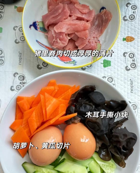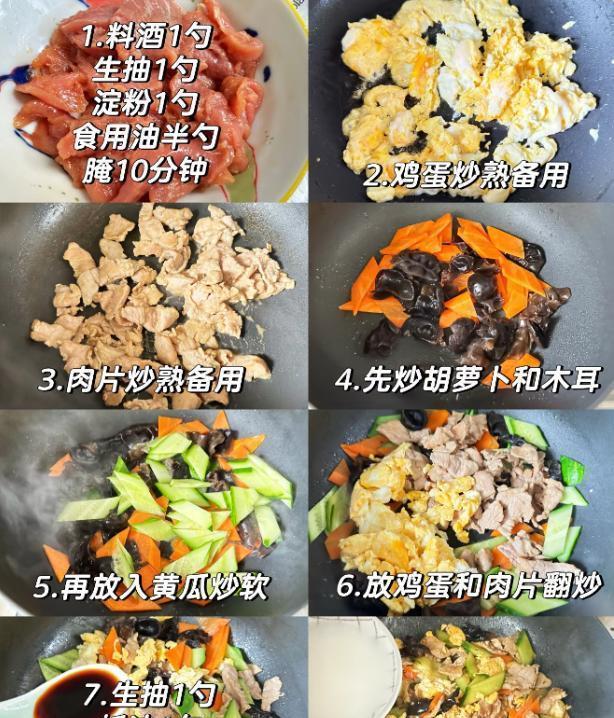 材料:适量猪肉片,2个鸡蛋,适量胡萝卜,适量木耳,适量黄瓜,生抽,料酒,淀粉,油,盐,水淀粉。