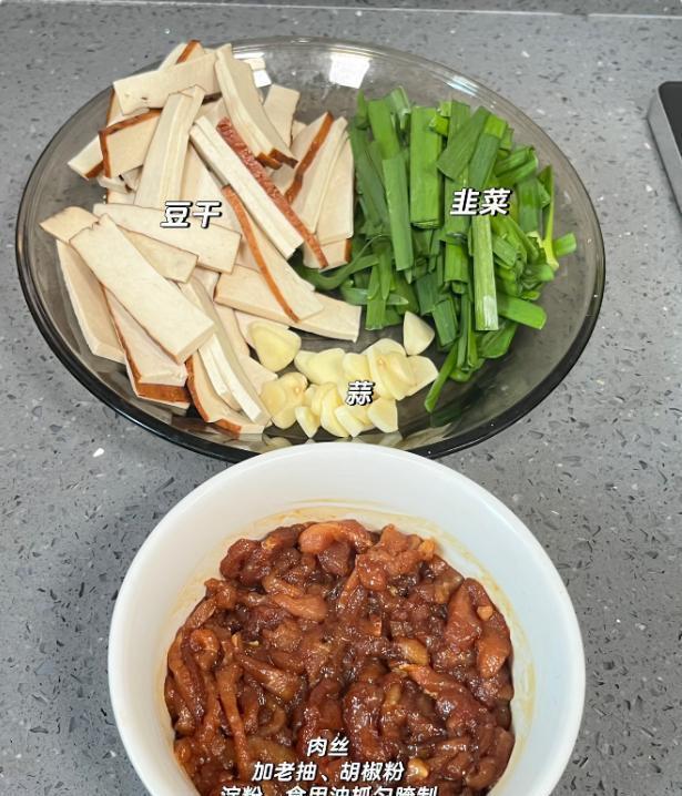 材料:适量豆干,一把韭菜,适量大蒜末,猪头丝,老抽,胡椒粉,玉米淀粉,油。盐,蚝油。