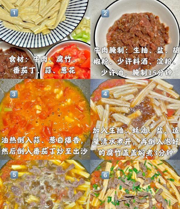 材料:牛肉,腐竹,番茄,大蒜,葱花,生抽,盐,胡椒粉,料酒,玉米淀粉,葱花。