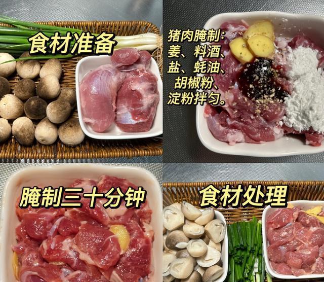 材料:适量草菇,适量猪肉,生姜,蚝油,葱段,料酒,胡椒粉,玉米淀粉。