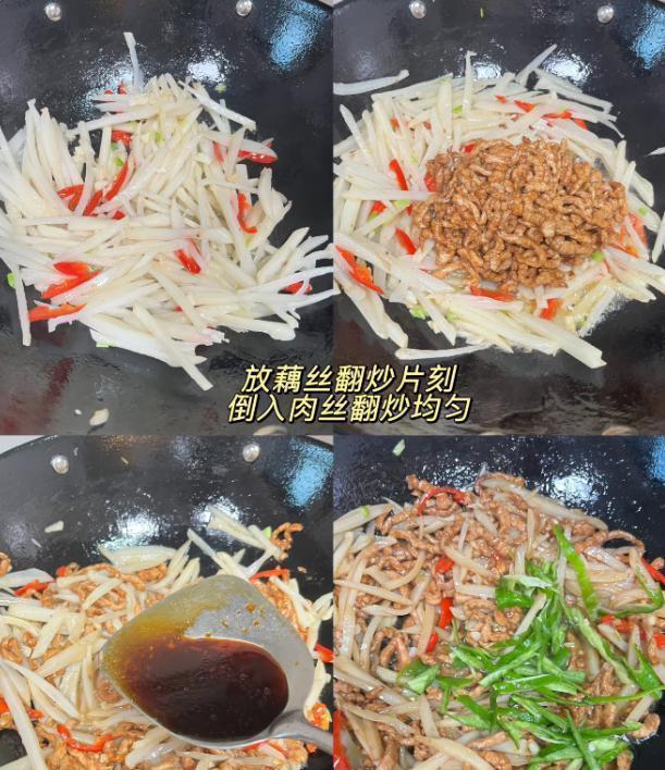 材料:适量猪肉丝,适量莲藕,老抽, 胡椒粉,玉米淀粉,食用油,葱姜蒜,生抽,盐,鸡精,青红椒。