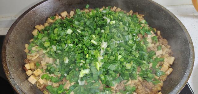 图片来源于网络 侵删第三步:豆腐干肉末炒匀后关火,扒开或者倒入盆中冷却,再将切碎的青蒜叶加入其中,完全搅拌均匀即成馅料待用。