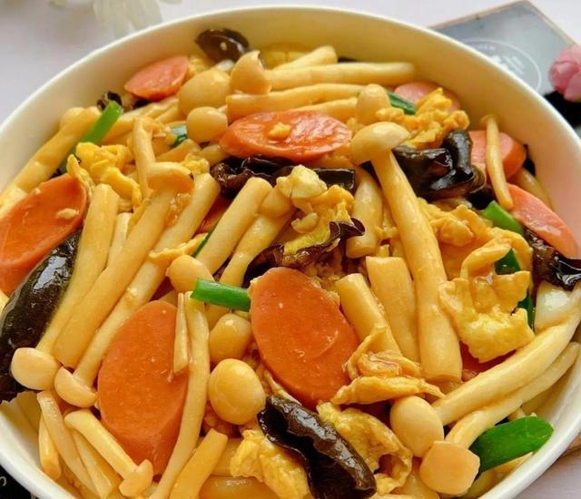 图片来源于网络 侵删食材: 你需要准备白玉菇一小把(约150克)、鸡蛋3个、火腿肠2根、蒜末少许、青红椒各半个用于点缀,还有适量的油、盐和生抽。