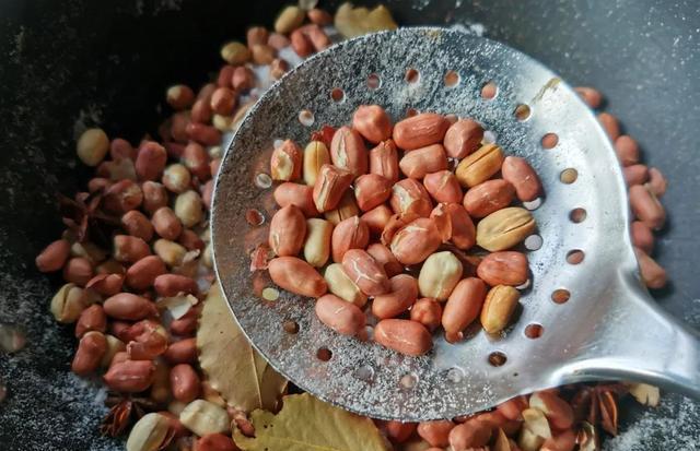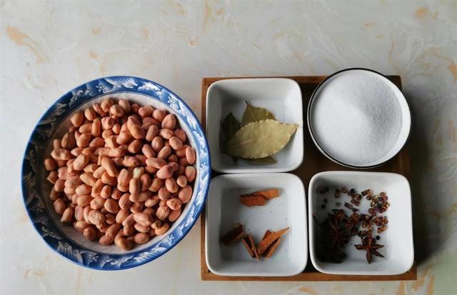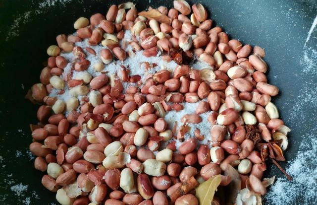 所需材料:花生米半斤、盐半袋、花椒20几粒、大料3-4个、香叶4-5片、桂皮1段、
