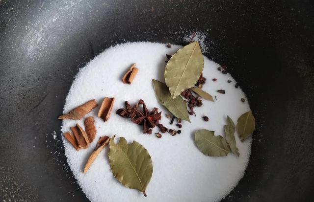 图片来源于网络 侵删2.把盐倒入锅内,再下入花椒,大料,桂皮,香叶。