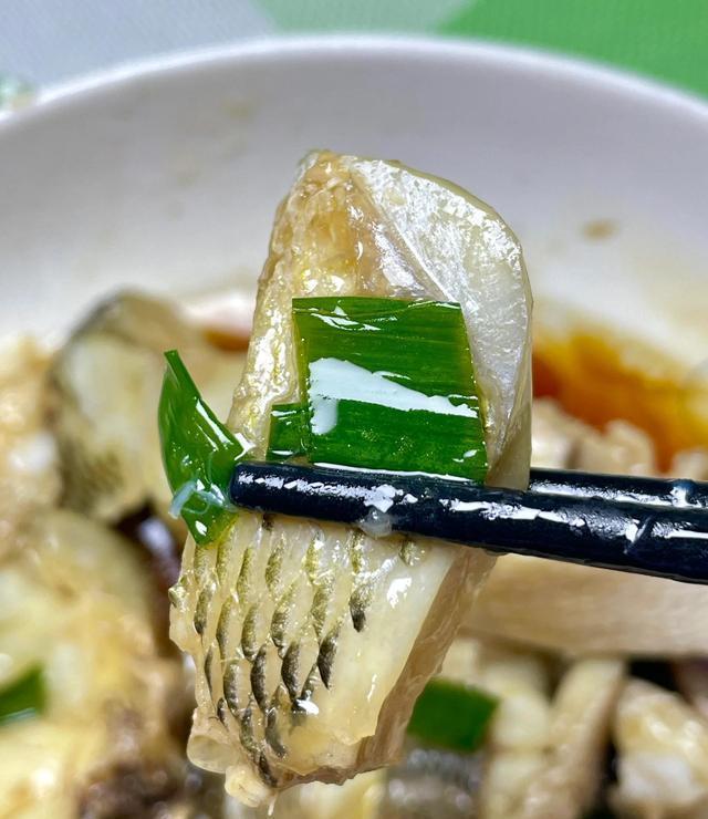 4. 取出鲈鱼,倒掉盘中腥水,捡去表面姜葱,重新铺一层新鲜葱丝;