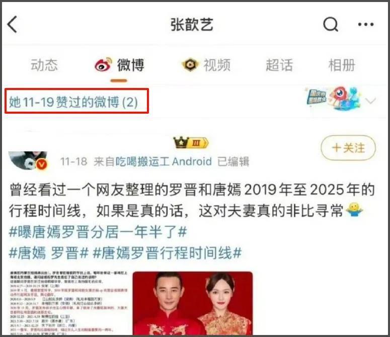 图片来源于网络 侵删但后来张歆艺又点赞唐嫣和罗晋分居的内容,张歆艺和唐嫣还有过合作,这是吃瓜手滑,还是知道内幕为唐嫣抱不平?
