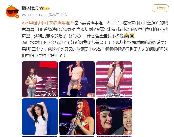 当“水果姐”这三个字从Katy Perry口中生涩又认真地念出时,杭州演唱会现场瞬间沸腾。2025年11月21日晚,这位国际巨星在互动环节随机抽取粉丝,主动询问自己的中文名怎么读,全场观众齐声高呼“水果姐”——她逐字跟读“水~果~姐~”的场面,立刻成为社交媒体上疯传的“名场面”。