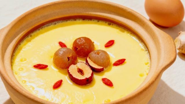 - 做法:鸡蛋打入碗中,加少许盐搅匀,倒入温水(水温约40℃,与蛋液比例1:1.5)再次搅拌;用滤网将蛋液过筛到蒸碗中,放入去核的桂圆和红枣;蒸锅水烧开后,将蒸碗放入蒸锅中,小火蒸8分钟,关火焖2分钟即可。