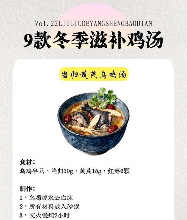 图片来源于网络 侵删一、补气血首选款|当归黄芪乌鸡汤食材清单乌鸡半只、当归10g、黄芪15g、红枣6颗、姜片3片、料酒1勺、盐适量详细步骤4. 乌鸡切块,冷水下锅加料酒、姜片,大火煮3分钟撇净血沫,捞出用温水冲干净;5. 砂锅放足量清水,放入乌鸡、当归、黄芪、红枣、姜片,大火煮沸后转小火慢炖2小时;6. 出锅前10分钟加盐调味,汤色金黄,喝着暖心又补气血~