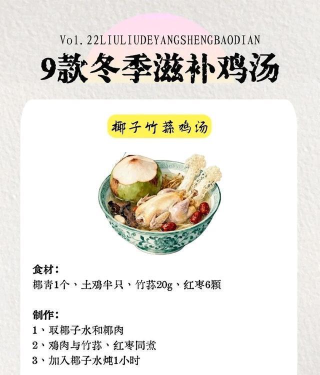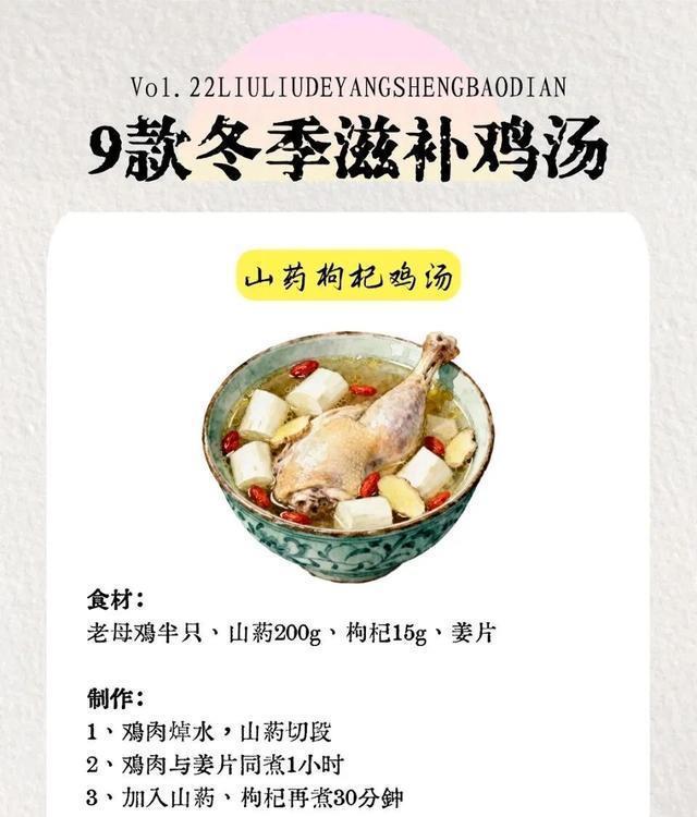 图片来源于网络 侵删二、全家爱喝款|山药枸杞鸡汤食材清单老母鸡半只、铁棍山药200g、枸杞15g、姜片4片、盐适量详细步骤4. 老母鸡切块焯水(冷水下锅煮3分钟去血沫),冲净后放入砂锅,加清水没过食材,大火煮1小时;5. 山药去皮切滚刀块,避免氧化可泡在清水中,放入砂锅中继续炖30分钟至软糯;6. 最后加枸杞煮5分钟,加盐调味,清甜不腻,健脾养胃超适合全家喝