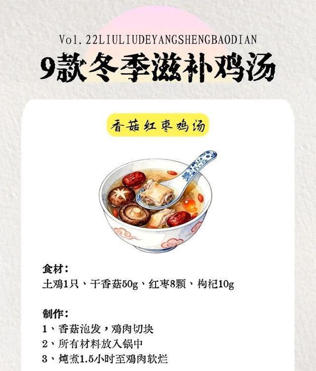 图片来源于网络 侵删三、菌香浓郁款|香菇红枣鸡汤食材清单土鸡1只、干香菇10朵、红枣8颗、枸杞10g、姜片2片、料酒1勺、盐适量详细步骤4. 干香菇用温水泡发30分钟(泡香菇的水过滤留着,增香超管用);5. 土鸡切块冷水下锅,加料酒、姜片焯水3分钟,撇沫后冲净,和香菇、红枣、姜片一起放入砂锅;6. 倒入泡香菇水+足量清水,大火煮沸转小火炖1.5小时,加枸杞煮10分钟,加盐即可,菌香直飘满屋