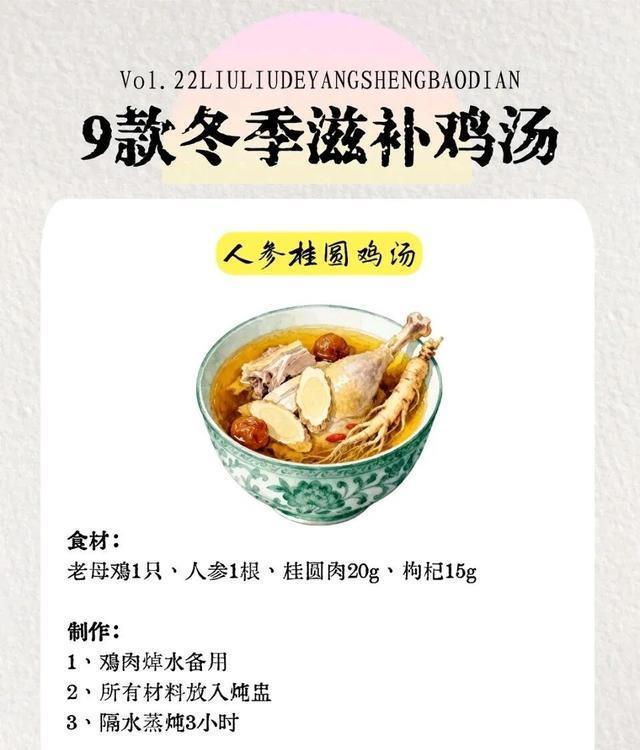 图片来源于网络 侵删四、补元气款|人参桂圆鸡汤 食材清单老母鸡1只、人参1根(约10g)、桂圆8颗、枸杞15g、姜片3片、盐适量详细步骤4. 老母鸡切块焯水冲净,放入炖盅,加入人参、桂圆、姜片,倒清水没过食材;5. 蒸锅加水烧开,放入炖盅隔水蒸炖3小时,中途别频繁开盖,保证鲜味不流失;6. 最后15分钟加枸杞,出锅前加盐,熬夜后喝一碗,补气安神超回血