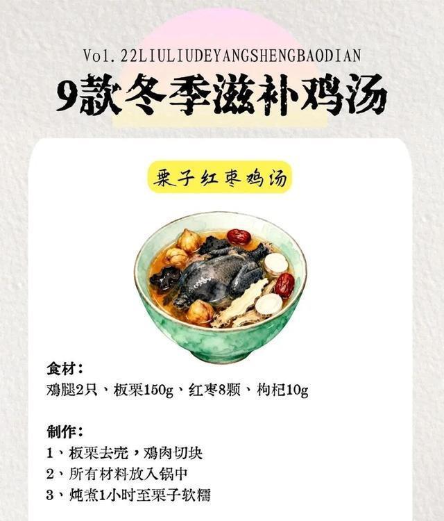 图片来源于网络 侵删七、暖心暖胃款|栗子红枣鸡汤食材清单鸡腿2只、板栗15颗、红枣8颗、枸杞10g、姜片3片、盐适量详细步骤4. 鸡腿切块冷水下锅焯水3分钟,撇沫冲净;板栗生煮5分钟,趁热剥去外皮更轻松;5. 砂锅放鸡腿、板栗、红枣、姜片,加清水没过食材,大火煮沸转小火炖1小时,至板栗软糯;6. 加枸杞煮5分钟,加盐调味,甜香入味,冬天喝着超暖身