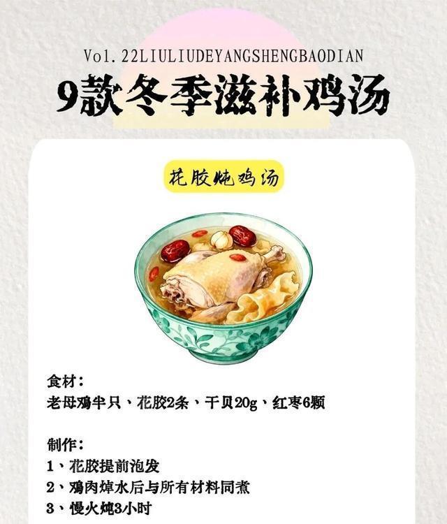 图片来源于网络 侵删九、美容养颜款|花胶炖鸡汤食材清单老母鸡半只(约500g)、花胶20g、干贝5颗、红枣6颗、姜片3片、盐适量详细步骤4. 花胶提前用清水泡发12小时(中途换2次水,避免滋生细菌),干贝用温水泡软;5. 老母鸡、干贝分别焯水3分钟,冲净后和花胶、红枣、姜片一起放入炖盅;6. 加清水隔水炖2.5小时,出锅前加盐,胶质满满,喝出好皮肤