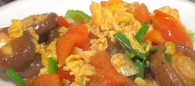 香菇钾含量也极高,且富含膳食纤维,有助于消化。这道香菇炒鸡蛋搭配西红柿和青椒,营养丰富,味道鲜美。