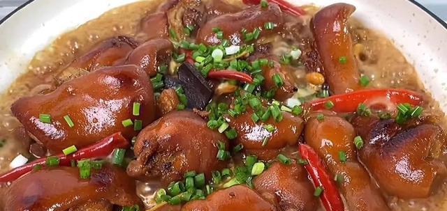猪蹄烧皮后切块,黄豆提前浸泡。冷水下锅焯水,加入姜片、葱段和料酒,煮5至6分钟后捞出猪蹄冲洗干净。锅中加少许油,放入冰糖炒至枣红色,加入猪蹄翻炒上色。加入姜片、花椒、八角、桂皮和干辣椒,再加入米酒、生抽、老抽、蚝油和适量盐,炒至均匀上色。倒入清水没过猪蹄,大火煮开后炖煮30分钟,或使用高压锅压10分钟。炖煮至猪蹄酥烂时加入黄豆,再炖煮5至7分钟或高压锅压5分钟,最后撒上葱花即可。这道黄豆焖猪蹄口感酥烂,味道浓郁,既能增加肌肉弹性,还能补充钾和蛋白质,适合中老年人滋补身体。