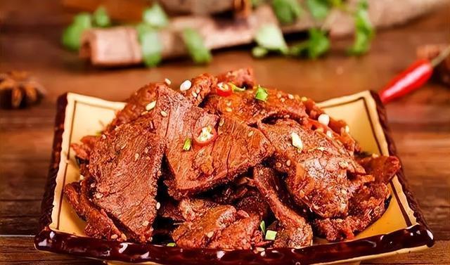 炒锅置旺火上,倒入花生油烧至200℃时,投入牛肉片,炸至八成熟时捞出,放入制好的卤汁中,浸卤至肉烂入味。牛肉片经油炸后再卤制,鲜香可口,饱含卤汁且滋味醇厚。冷却后装盘即可食用。